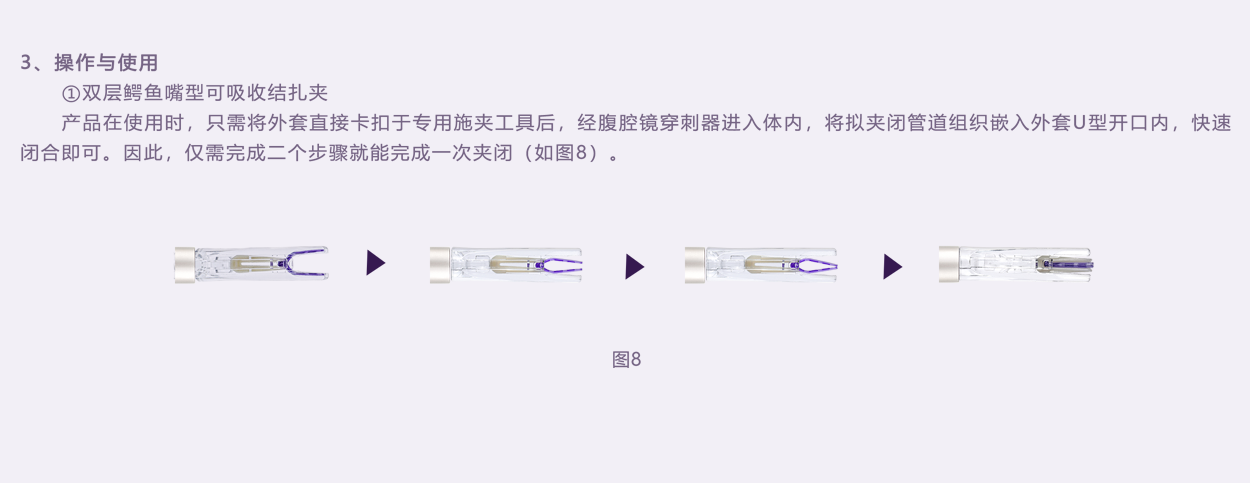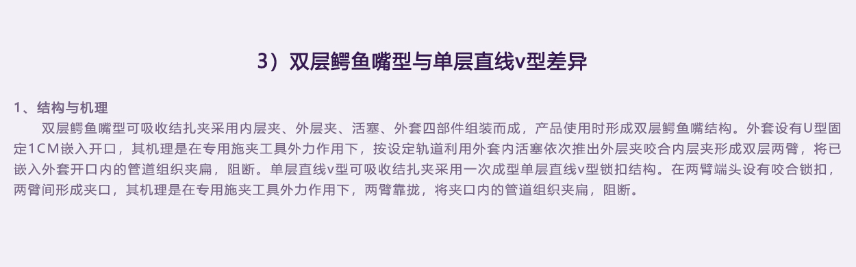 內外層夾為雙色設計,涇渭分明。實際使用中內外層夾配合夾閉管腔效果一目了然,避免錯誤判斷。
